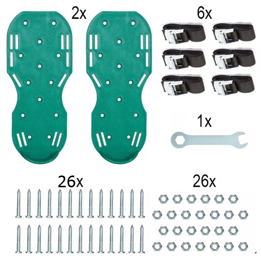 Аератор для газону ножний представляє собою дві пластини-сандалії з міцного пластику, в які вкручуються спеціальні металеві шипи і закріплюються в основі.